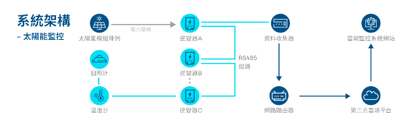 具有高穩定性高相容性及簡易安裝等特色,支援市面上所有型號的逆變器、電錶、類比數位轉換器及氣象感測器。 |